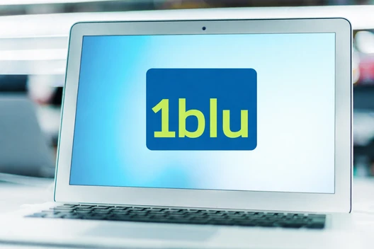 Laptop mit geöffnetem Bildschirm; Anzeige zeigt JIMDO in einem schwarzen Rechteck auf blauem Hintergrund.