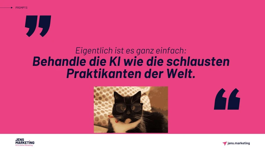 Prompting: KI ist dein schlauester Praktikanten – der alle Websiten und alle Bücher dieser Welt gelesen hat. Denke beim prompten daher so: Was müsstest du diesem schlauesten Praktikanten im echten Leben mitgeben, um dein gewünschtes Ergebnis zu bekommen? Welche Anweisungen würde er benötigen? Welchen Kontext benötigt er? Welches Feedback braucht er? Auf Basis dessen kannst du aktuell ein sehr gutes Briefing für die KI erstellen.