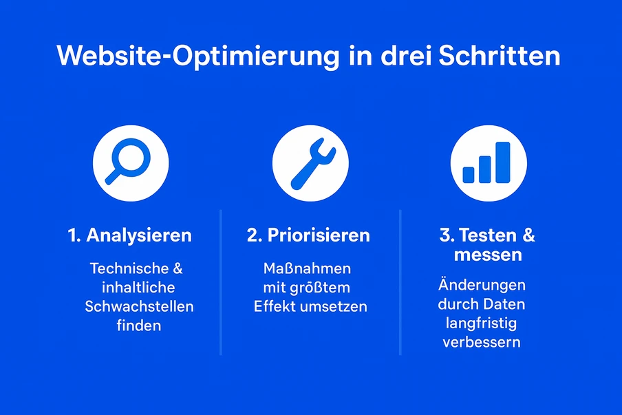 Doch was genau bedeutet „optimieren“? Und wo fängt man an – bei der Technik, beim Design oder beim Inhalt? In diesem Artikel bekommst du einen klaren Fahrplan, wie du deine Website Schritt für Schritt verbesserst. Du lernst, welche Bereiche am meisten Wirkung zeigen, welche Tools dir die Arbeit erleichtern und wie du mit modernen Methoden – inklusive KI – noch mehr rausholst.