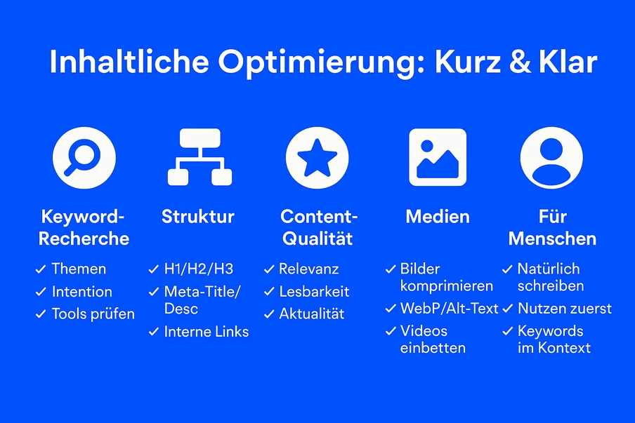 - Content überarbeiten (aktuelle Texte, klare Struktur, sinnvolle Keywords)
